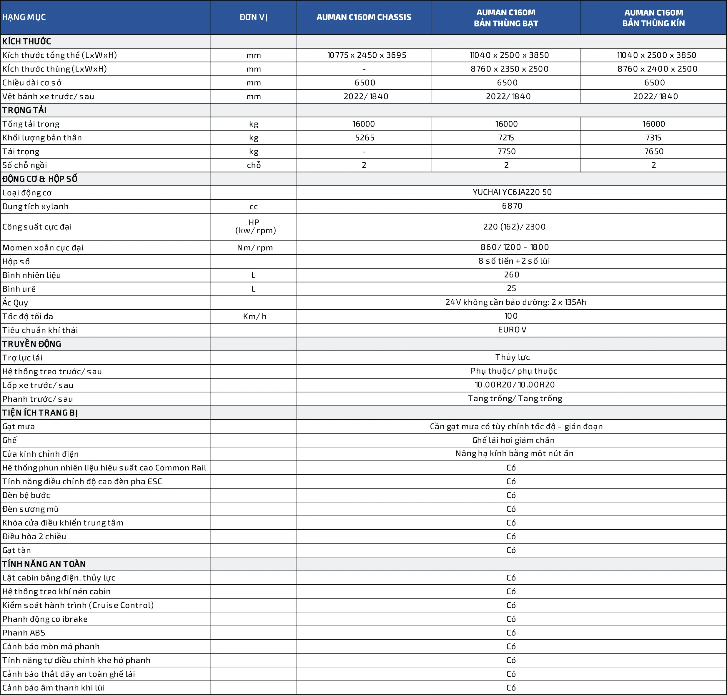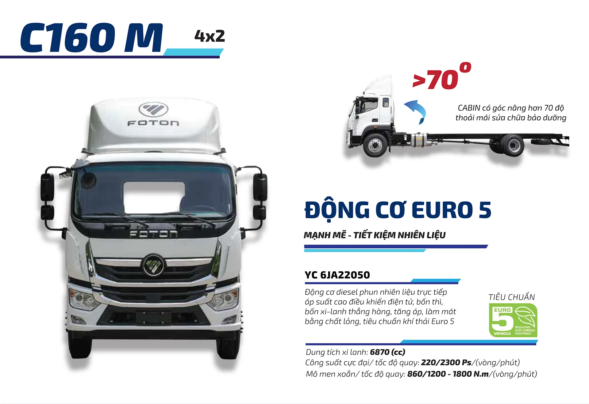 Foton Auman C160M là xe tải thùng hạng nặng 4×2 với trọng tải: 18 tấn, một thế hệ sản phẩm hoàn toàn mới của Foton được phát triển, áp dụng cho các loại tình hình giao thông. Kết hợp với động cơ Yuchai YC6JA220-50, hộp số tay Fast 8, cabin thời trang và thông minh mang lại cho người lái cảm giác lái xe thoải mái tiện nghi.