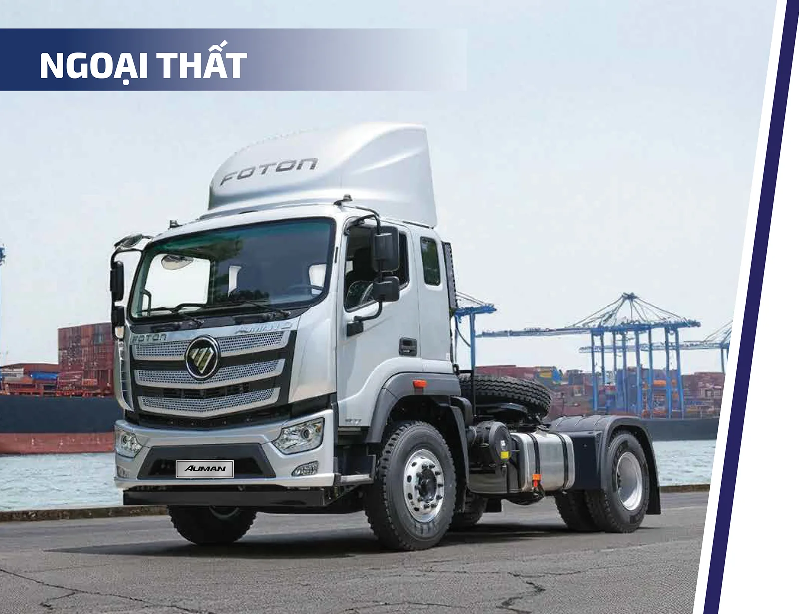 Foton Auman FV270 là một xe đầu kéo 4 x 2, sức khéo 29 tấn, được cấu hình phù hợp với vận chuyển hậu cần cảng, đặc biệt là xử lý nhẹ, quay dễ dàng và tiết kiệm nhiên liệu hiệu quả cao. Với động cơ Cummins ISD270 50, hộp số tay Fast 8, chiều rộng cabin 2200mm, độ bền cabin đáp ứng các yêu cầu của tiêu chuẩn châu Âu.