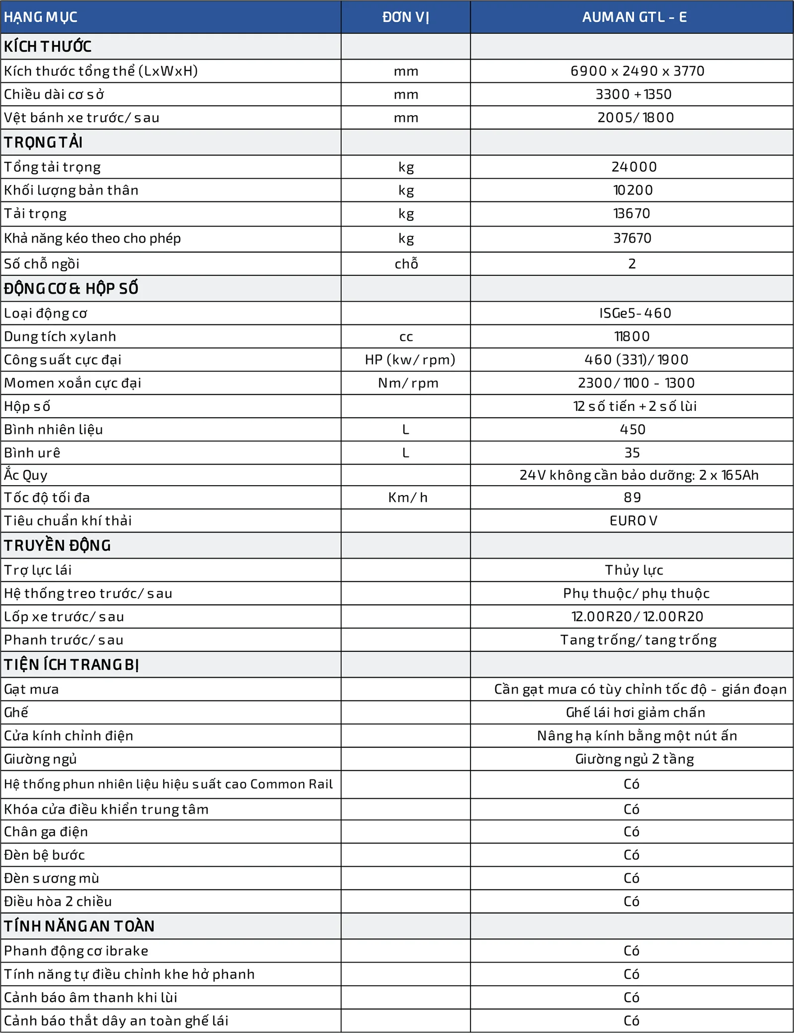 Thông số của AUMAN GTL – E
