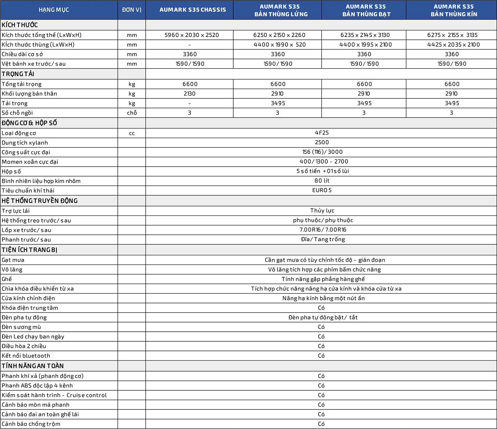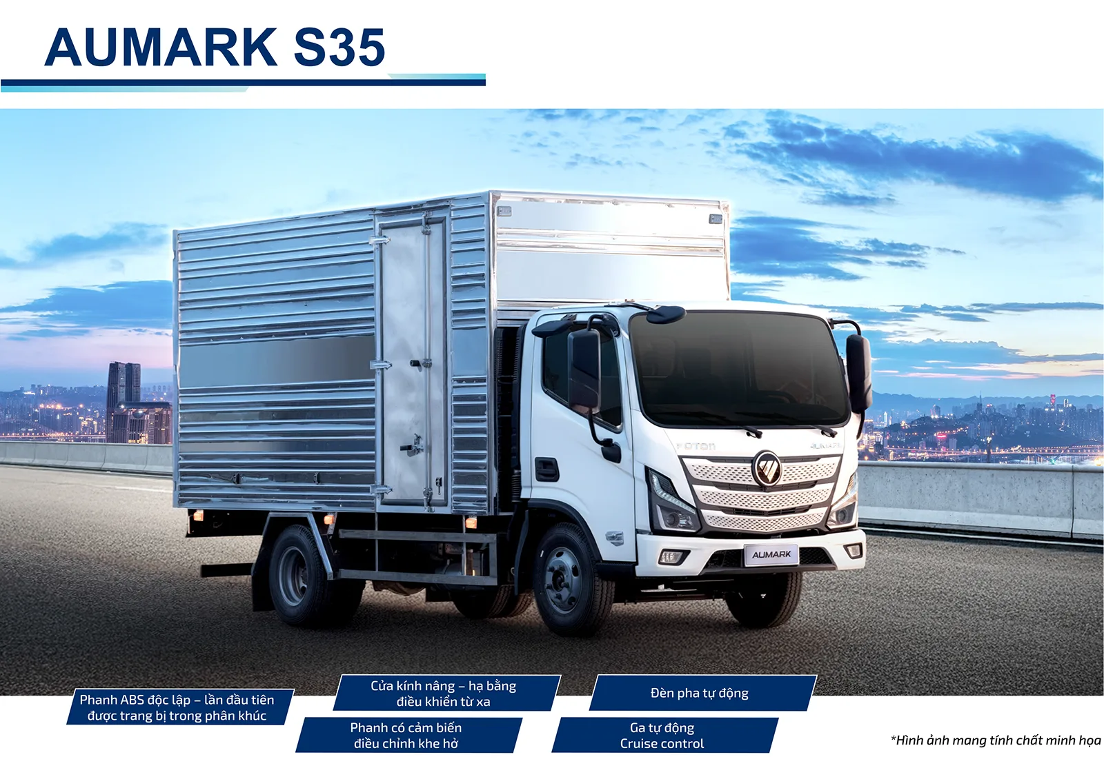 Dòng sản phẩm AUMARK S35 thuộc thế hệ mới nhất của Foton, một chiếc xe tải nhẹ thực dụng, đáng tin cậy và thoải mái, được trang bị động cơ AUCAN tiêu chuẩn EURO 5 và hộp số công nghệ ZF, giúp lái xe linh hoạt nhờ độ tin cậy mạnh mẽ, thông minh và an toàn, đáp ứng nhu cầu vận chuyển logistis, hậu cần đa dạng trong đô thị