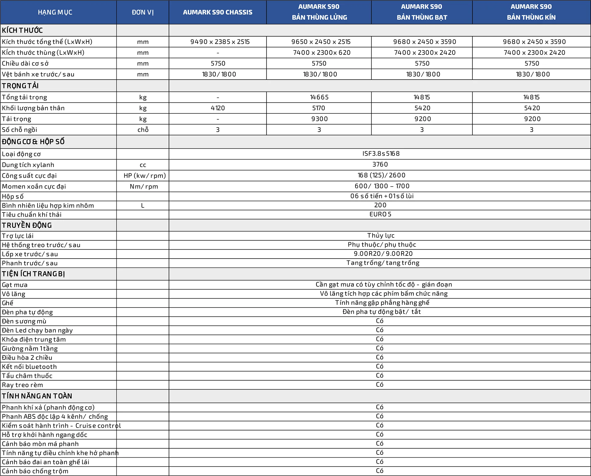 Với những ưu điểm nổi bật này, AUMARK S90 trở thành lựa chọn lý tưởng cho các nhu cầu vận tải liên thành phố, ngoại ô và các tuyến logistics yêu cầu độ ổn định cao, tiết kiệm nhiên liệu và vận hành bền bỉ trong thời gian dài. Đây chính là mẫu xe tải đáp ứng hài hòa cả công suất – độ bền – hiệu quả khai thác, giúp doanh nghiệp nâng cao hiệu suất vận chuyển một cách tối ưu.